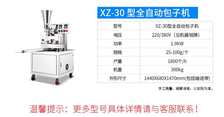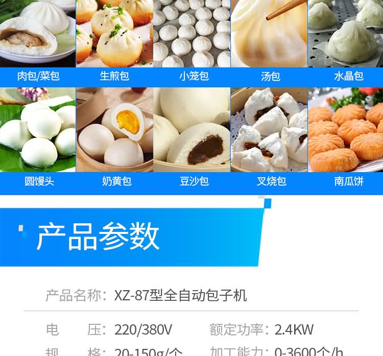 XZ-87型全自動包子機,可生產各種肉包、菜包、肉菜包、小籠包、湯包、水晶包、圓饅頭、奶黃包、豆沙包、叉燒包、南瓜餅、煎堆等十幾種包餡制品。適用于賓館、飯店、學校、機關企業食堂、饅頭或包子加工廠、早餐工程店及速凍食品廠等單位。可滿足不同客戶群體。免費提供工藝技術。免費上門培訓指導安裝。