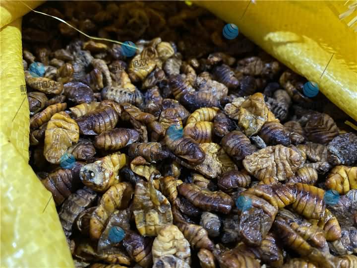 蠶蛹烘干前體內油脂甚多,有些肥碩點一捏就出汁: