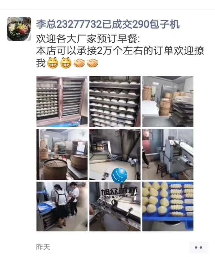 李總做包子十幾年了,從剛開始兩個人的夫妻店一天賣幾百個包子到用了我們旭眾290仿手工包子機,一天可以接2萬個的訂單,感謝對我們旭眾包子機的支持!