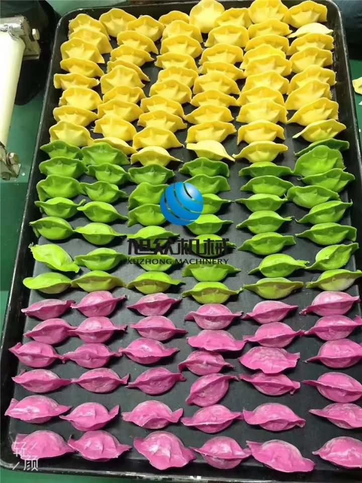 今日J(rèn)GB-210仿手工餃子機(jī)做三福餃子咯!用火龍果、菠菜、南瓜分別榨成汁再和面粉攪拌成不同顏色的面團(tuán),攪拌好的面團(tuán)再通過壓面機(jī)反復(fù)壓成面皮后,最后通過餃子機(jī)自動包餡成型一個個果蔬水餃: