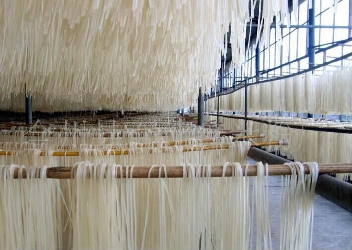 取大米60斤用凈水浸泡1-2小時,用手一搓就爛就可磨成米漿(也可將大米浸泡30分鐘,然后陰干表面水分磨成米粉,再用米粉調(diào)成米漿)。筋力源0.8斤與40斤淀粉干拌勻,加入米漿和勻,補充水分至總量45斤,和面糊至自然攤開為準。然后將和好的面糊放入自熟米線機擠絲、風扇降溫,再放入涼棚熟化8-12小時、用水浸泡20-50分鐘,然后搓散、陰干表面水分、包裝、銷售。